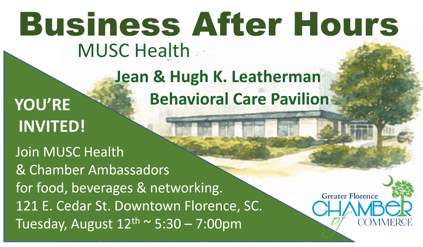 You are invited to join the Greater Florence Chamber of Commerce for an after-hours event on Tuesday, August 12th hosted by MUSC Health. The event will be held at the new Jean & Hugh K. Leatherman Behavioral Health Pavilion (121 E Cedar St) from 5:30 – 7:00 PM. The event will feature great food, drinks and networking. Be sure to bring lots of business cards!