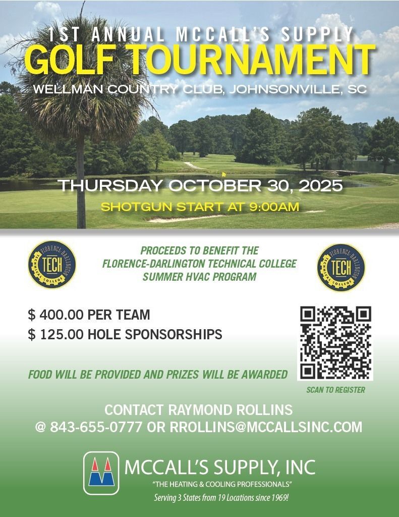 Join us in Johnsonville on Thursday, October 30th for the first McCall's Supply Golf Tournament. Proceeds will support scholarships for FDTC HVAC students who often don't receive financial aid for summers.