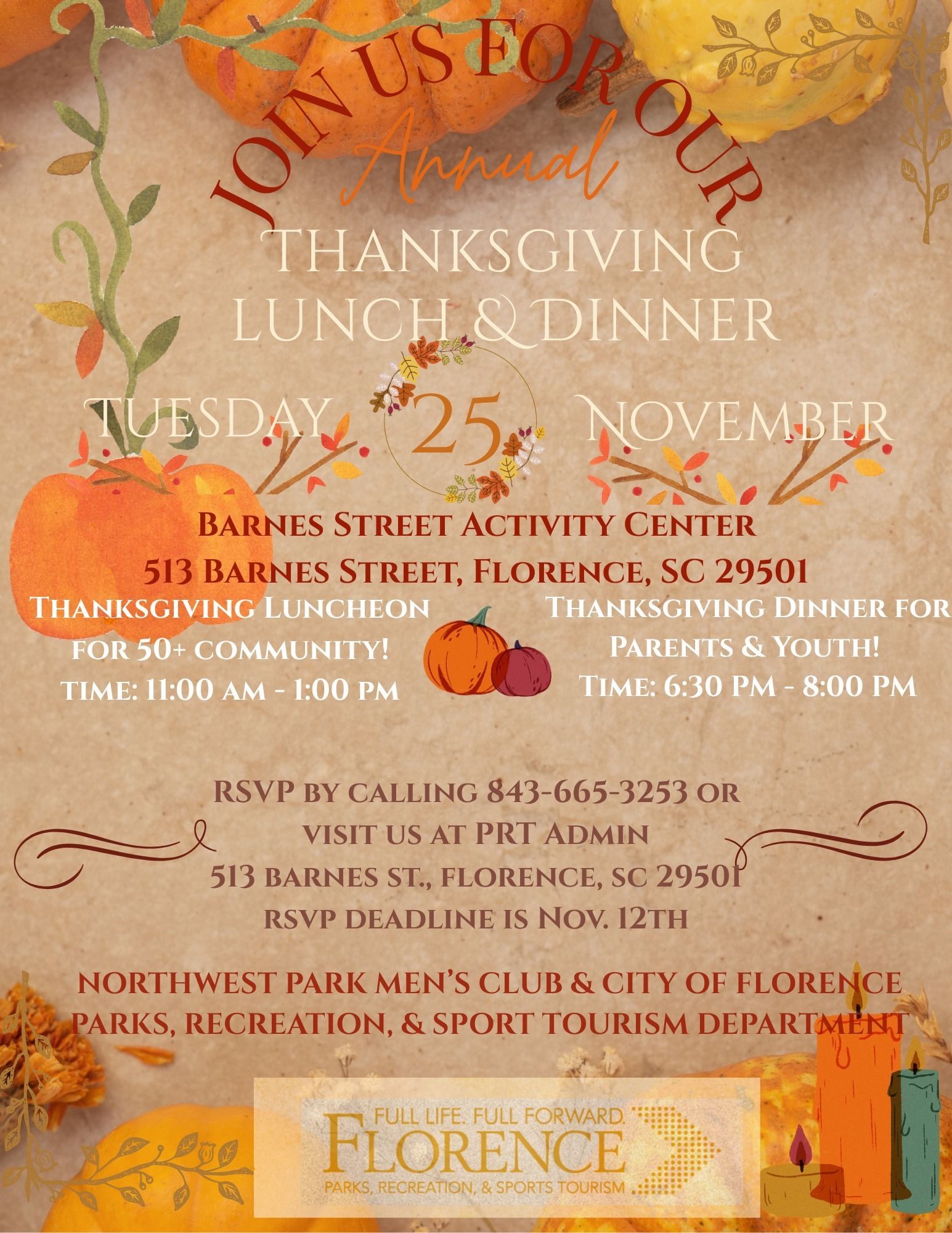RSVP by November 12 by calling 843-665-3253 or visiting us at 513 Barnes Street.