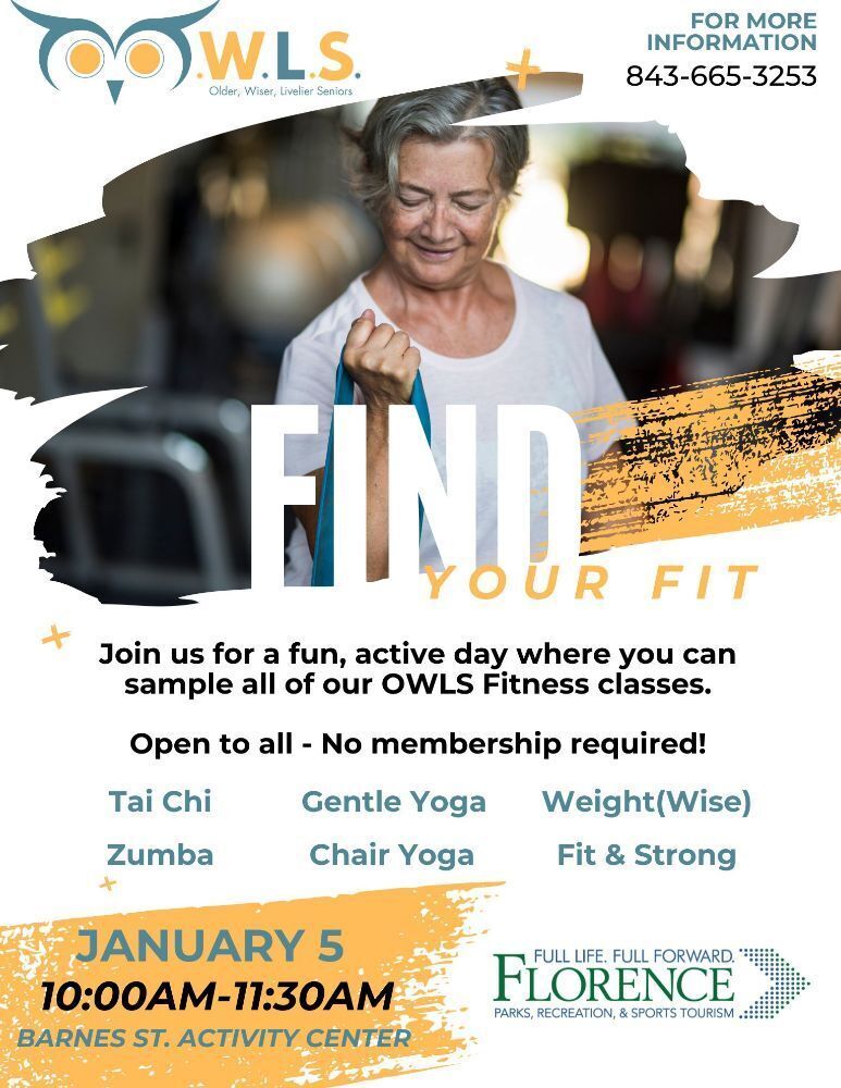 Find Your Fit Day will be held on Monday, January 5, 2026 from 10:00 am – 11:30 am at the Barnes Street Activity Center. Anyone age 50+ is welcome — you do NOT have to be an OWLS member.
